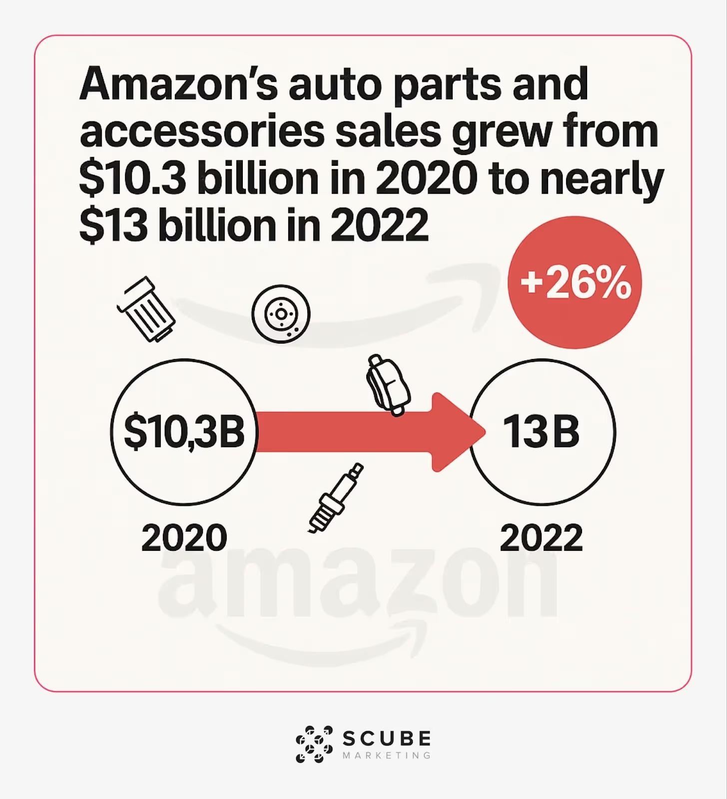 E-commerce is expanding even faster, rising from $96.81 billion in 2024 to $211.42 billion by 2029 (16.9% CAGR) (Source: GlobalNewswire). Amazon’s auto parts sales also grew from $10.3 billion in 2020 to nearly $13 billion in 2022. (Source: JungleScout)