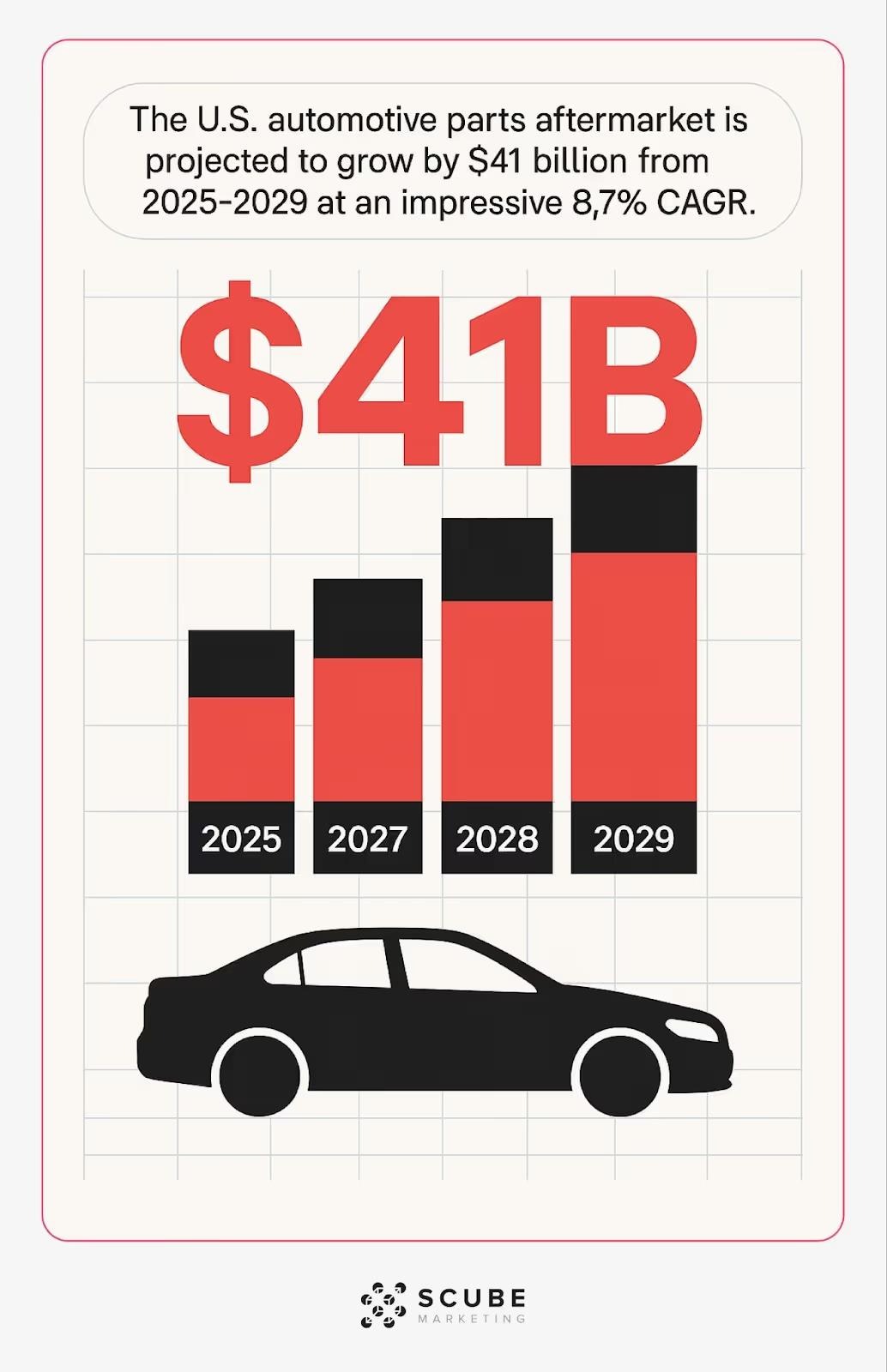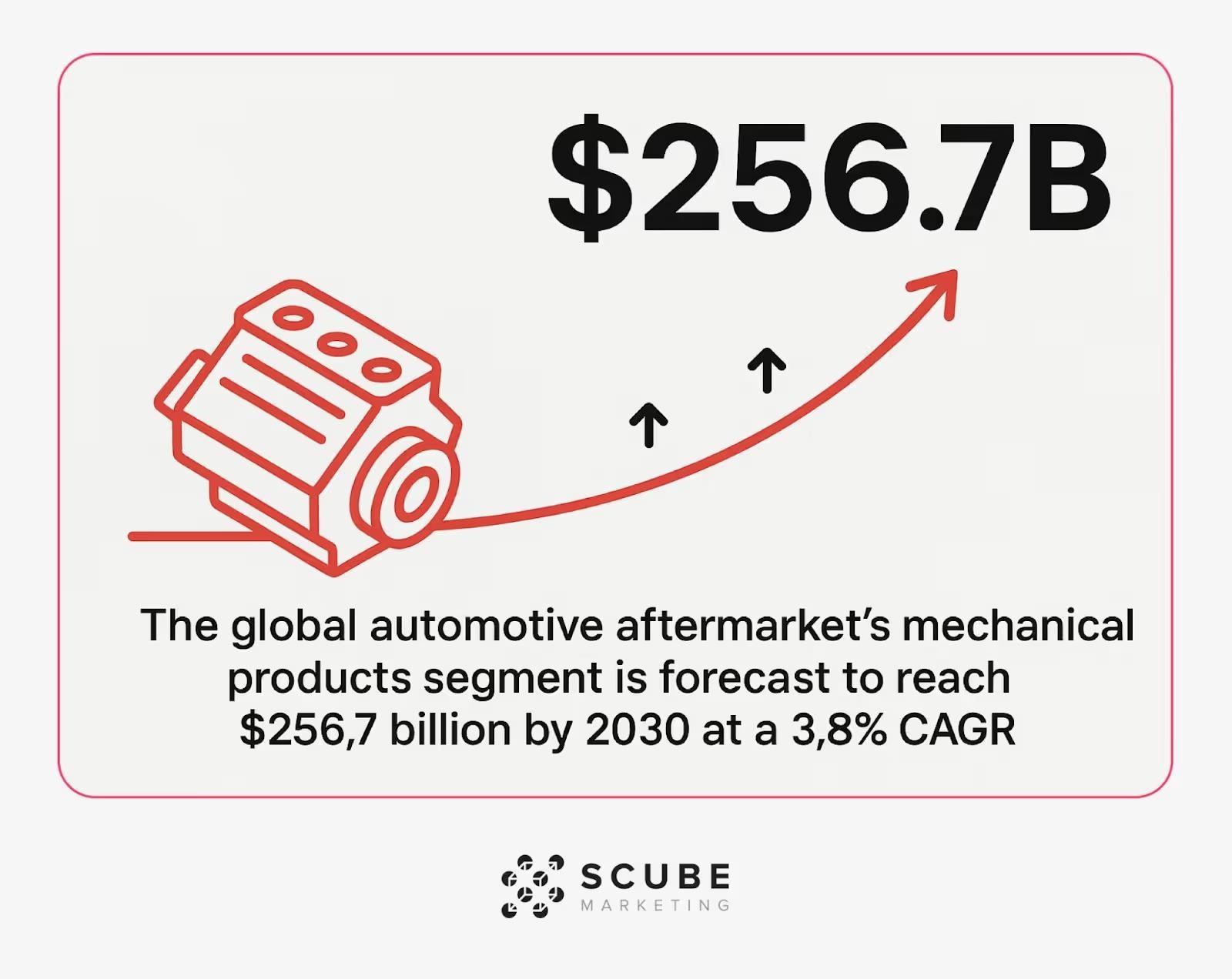 The data supports this growth. The global automotive aftermarket is projected to reach $256.7 billion by 2030 (3.8% CAGR) (Source: GlobalNewswire), while the U.S. market is expected to grow by $41 billion between 2025–2029 (8.7% CAGR). (Source: PRNewswire)