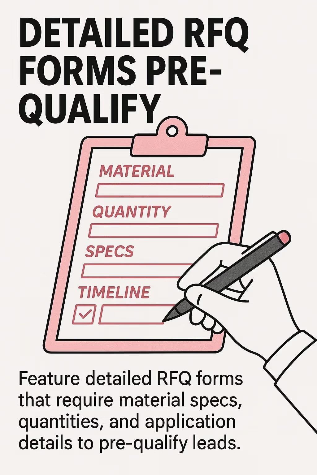 Industrial landing pages should not be generic contact pages. A strong approach is using a dedicated landing page per capability or service line, with an RFQ form that collects the details required for quoting.