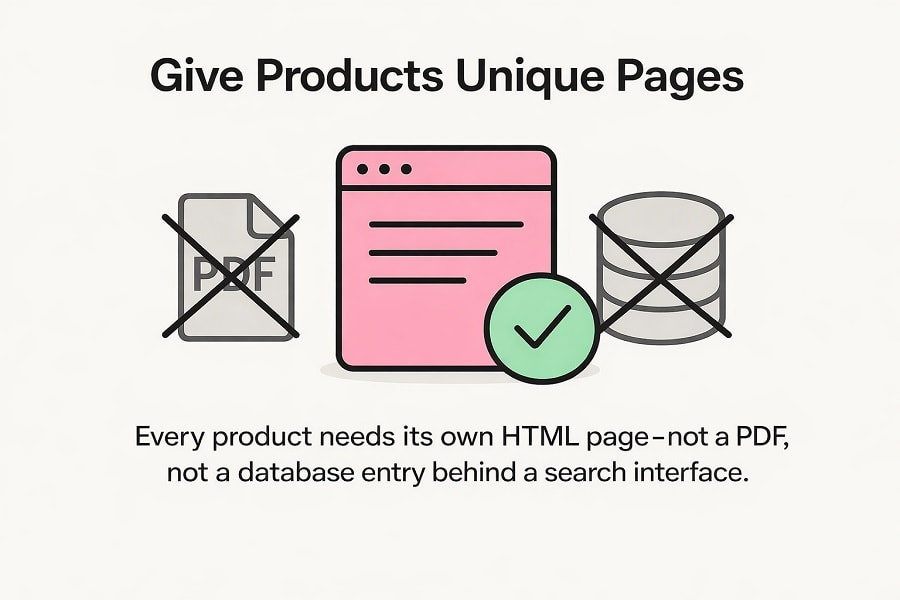 Every product needs a crawlable HTML page with a unique URL. Not a PDF. Not a database result behind filters. Strong web development supports clean templates, consistent URLs, and internal linking so pages can rank and help generate leads across long sales cycles.