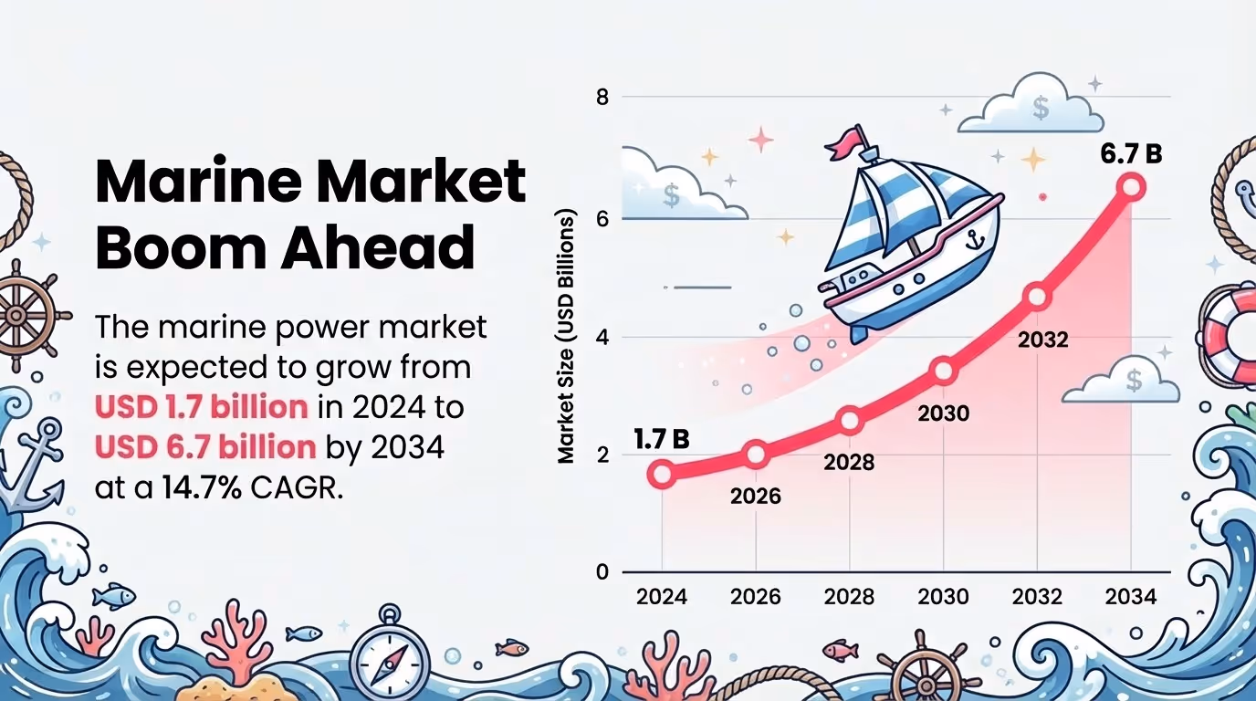 The marine industry market is growing fast. The marine power market is expected to grow from USD $1.7 billion in 2024 to USD $6.7 billion by 2034 at a 14.7% CAGR, with boaters increasingly researching and buying safety gear online.