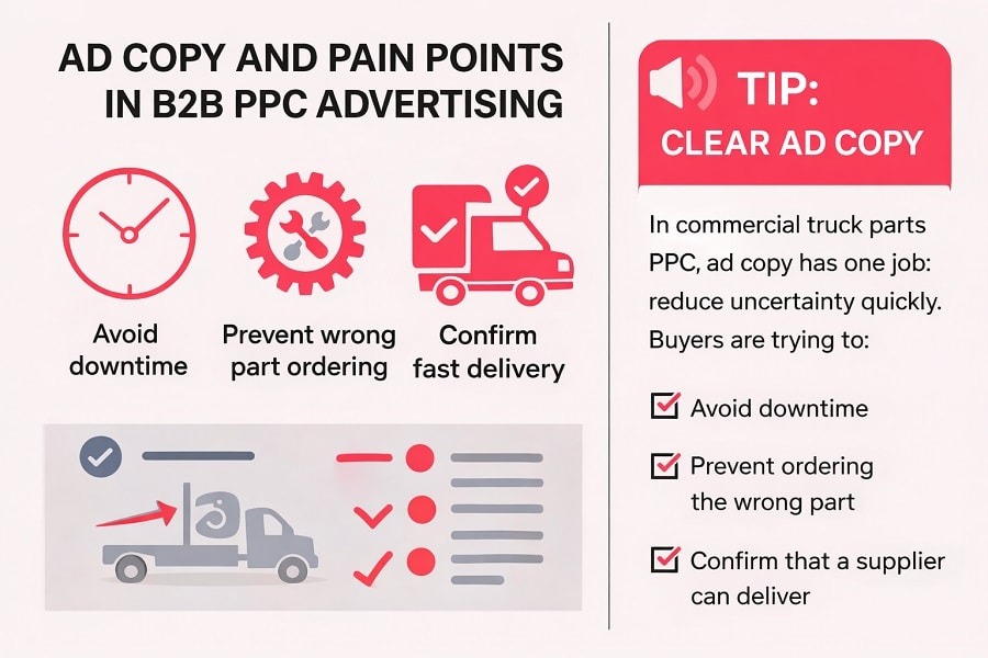 In commercial truck parts PPC, ad copy has one job: reduce uncertainty quickly. Buyers are trying to avoid downtime, prevent ordering the wrong part, and confirm that a supplier can deliver. Ads that do not immediately communicate fitment context, availability signals, or purchase options tend to attract low-quality clicks, even when keywords are strong.