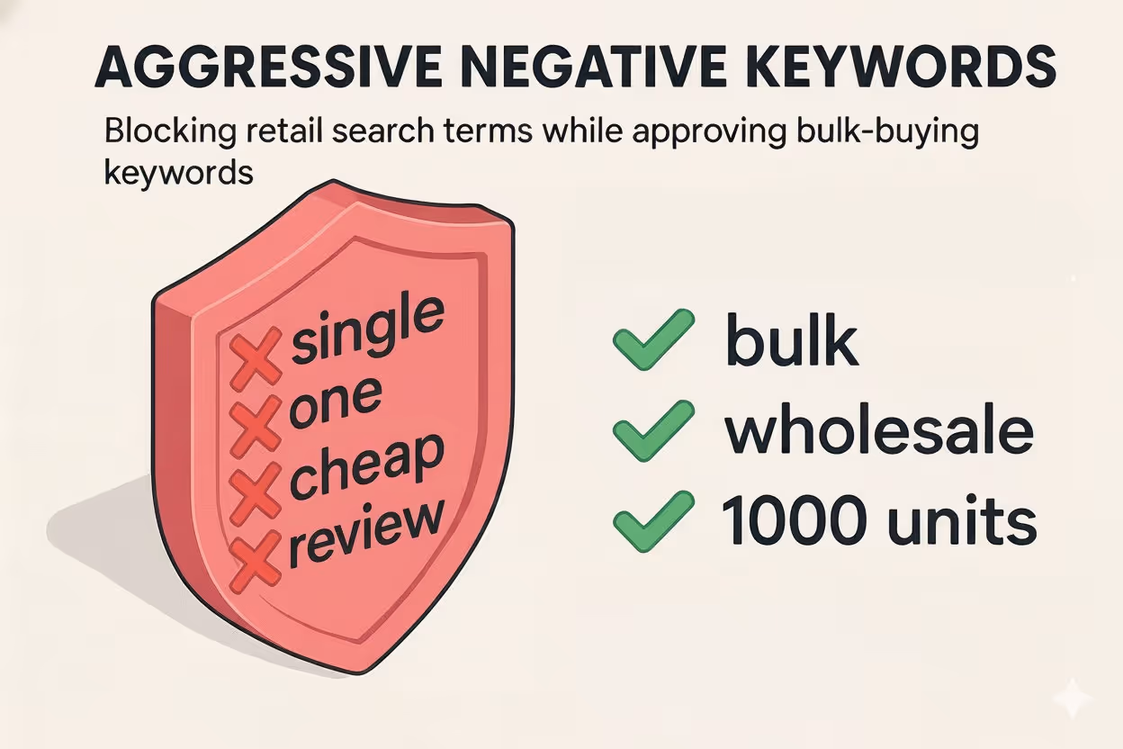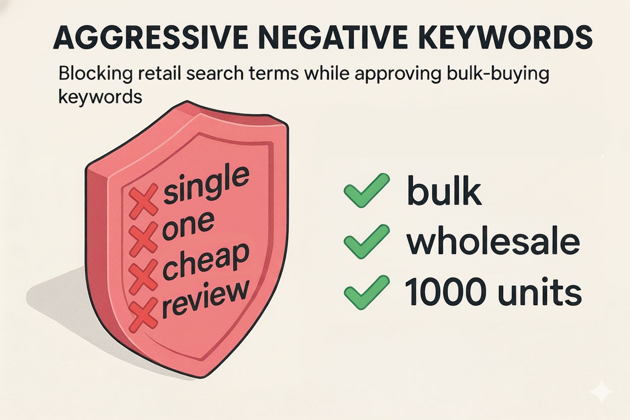 Negative keywords are critical for bulk PPE campaigns. You need to aggressively filter out retail shoppers to protect your ad spend. Every click from someone wanting single units costs money without generating revenue.