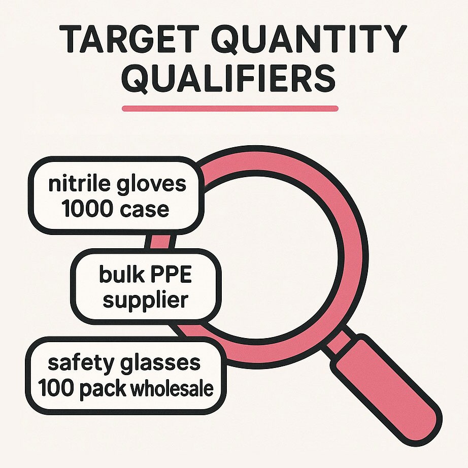 Long-tail keywords with quantity qualifiers convert exceptionally well for bulk orders. These are specific, low-volume searches from buyers with clear purchase intent. Someone searching "nitrile exam gloves medium powder-free 1000 case" knows exactly what they want.