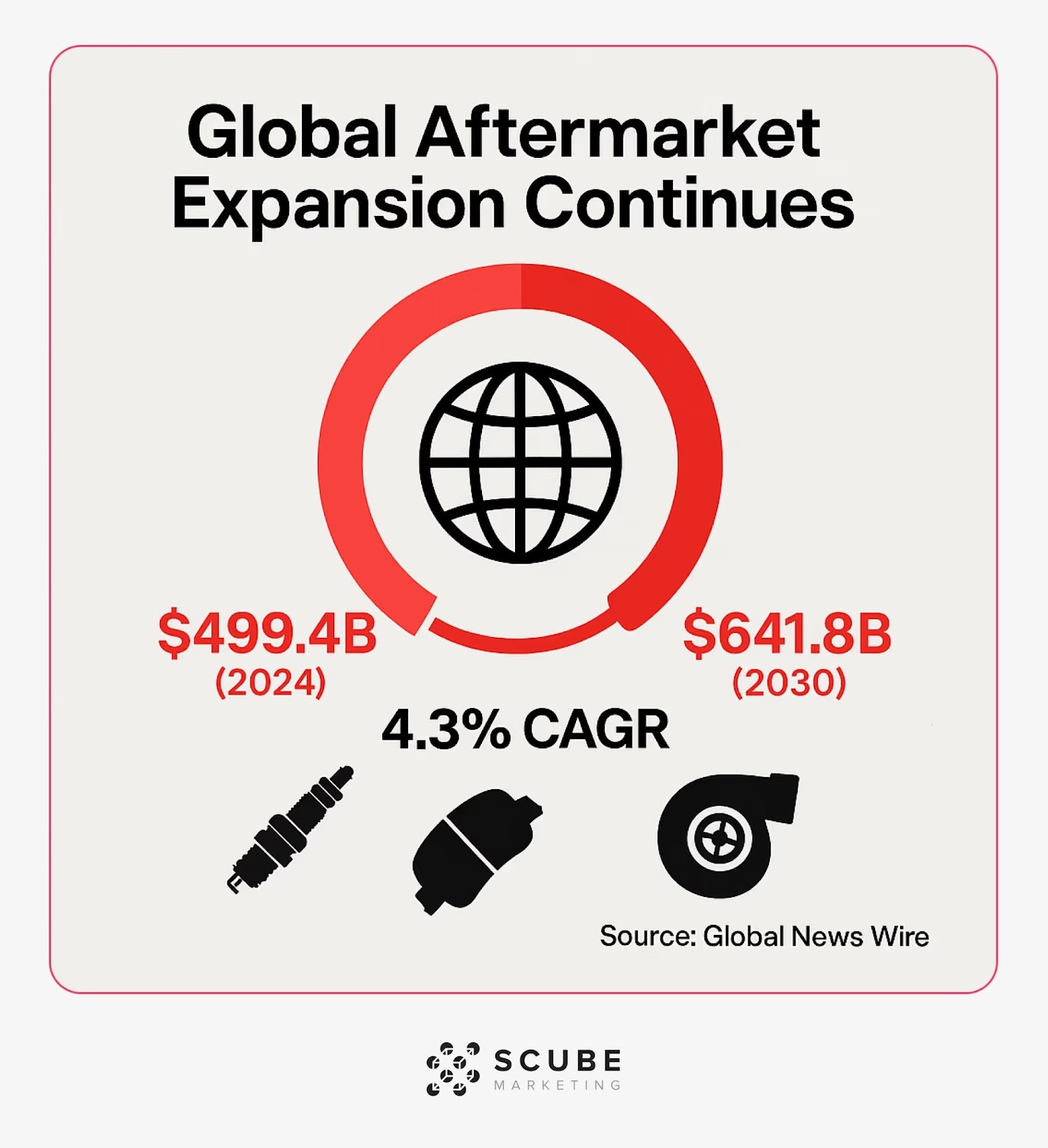 Globally, the automotive aftermarket is valued at $499.4B in 2024 and is expected to reach $641.8B by 2030, growing at a 4.3% CAGR. (Source: Global News Wire) Mechanical products remain a major part of the aftermarket industry and are forecasted to reach $256.7B by 2030. (Source: Global News Wire)