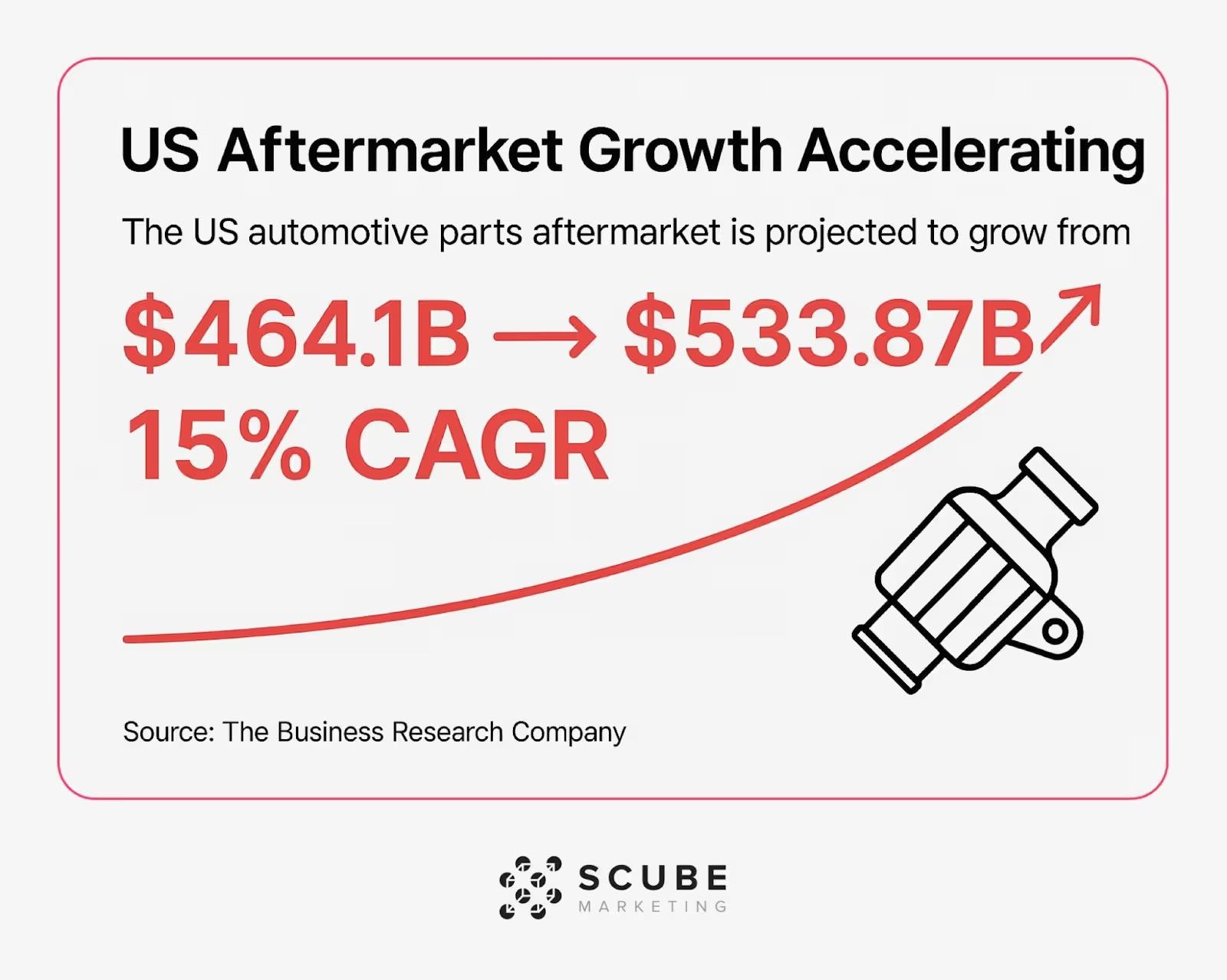 The numbers show why this space matters. The US automotive parts aftermarket is projected to grow from $464.1B in 2024 to $533.87B by 2025, representing a 15% CAGR. (Source: The Business Research Company)