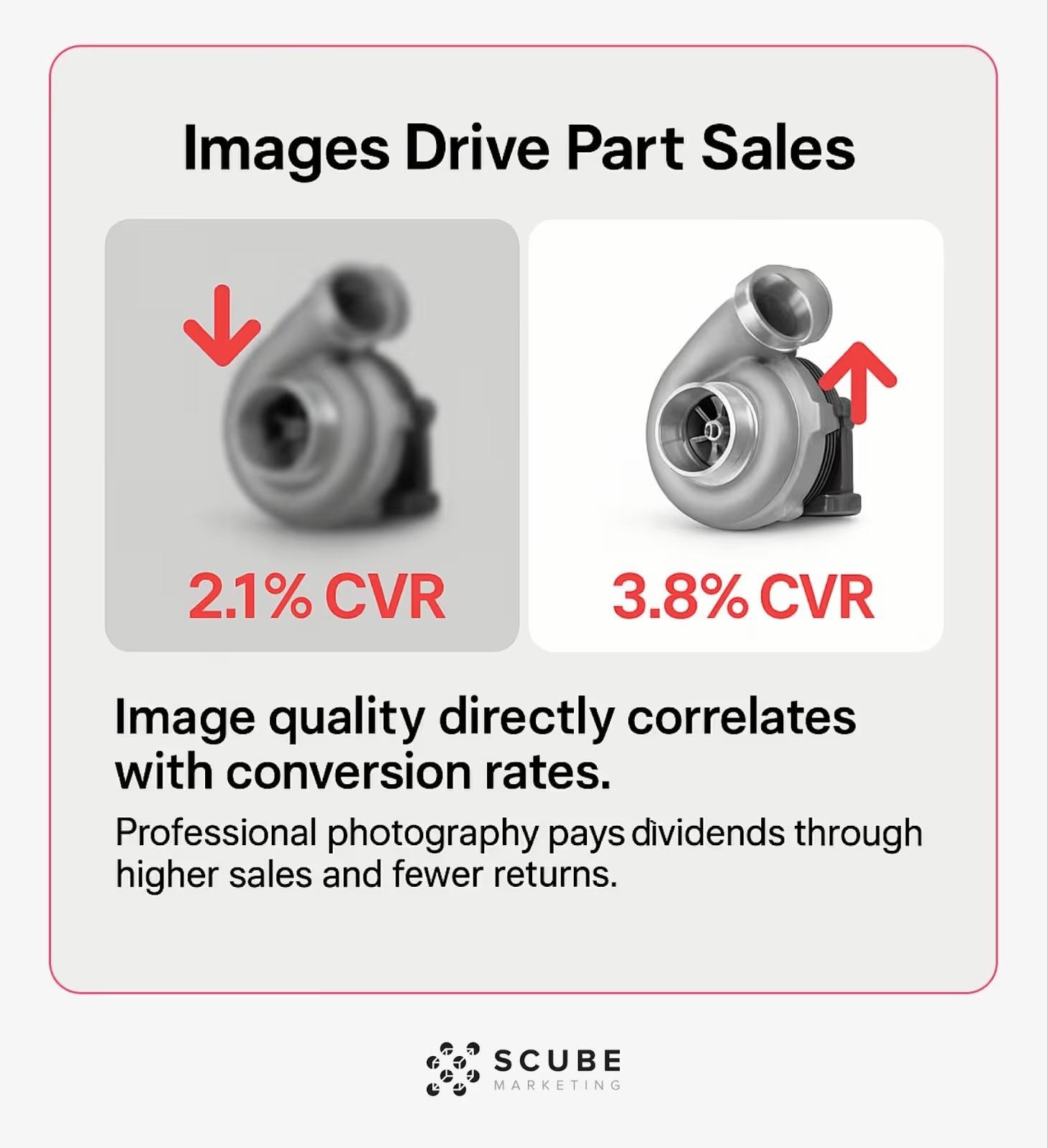 Images are critical in this niche. Buyers want to inspect the product visually before they commit. Strong photography helps increase brand's visibility, builds confidence, and gives shoppers a better feel for the quality of the part.